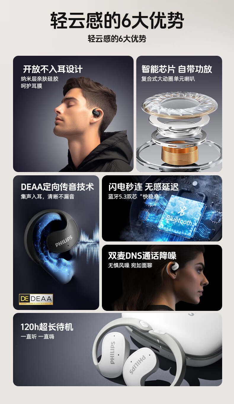 飞利浦(PHILIPS)骨传导概念真无线挂耳开放耳夹式不入耳运动跑步蓝牙耳机长续航高端降噪通用苹果华为TAT2708-黑